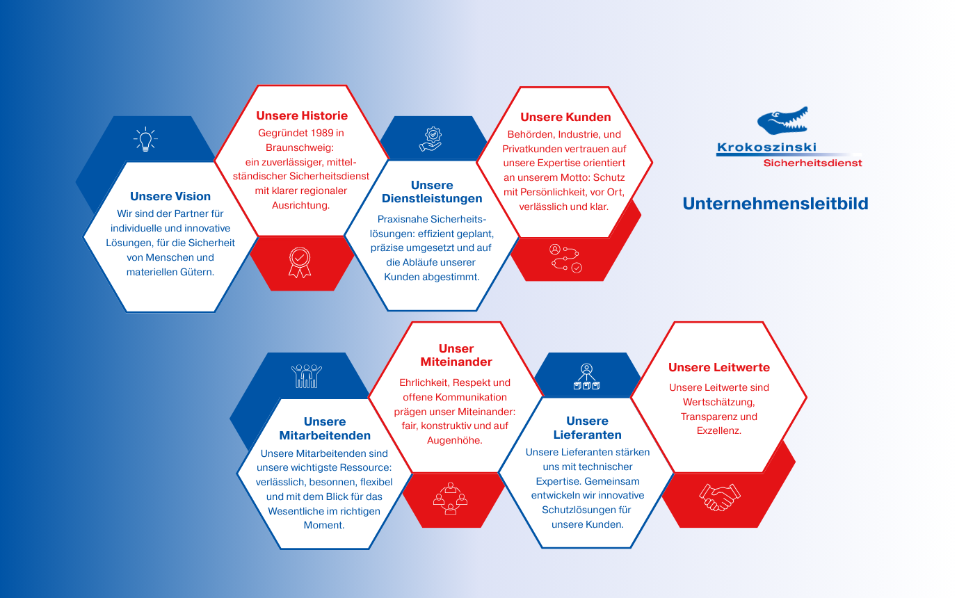 Hier finden Sie das Unternehmensleitbild der Krokoszinski Sicherheitsdienst GmbH & Co. KG.